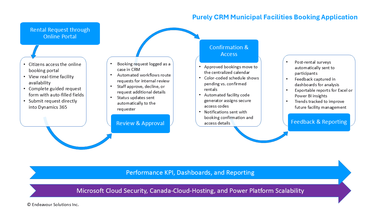 Endeavor4 CRM’s Facilities Booking Application is a purpose-built solution designed to help municipalities and organizations modernize how they manage facility rentals. Built on Microsoft Dynamics 365 and the Power Platform, this application automates bookings, simplifies approvals, and provides real-time visibility into facility usage.