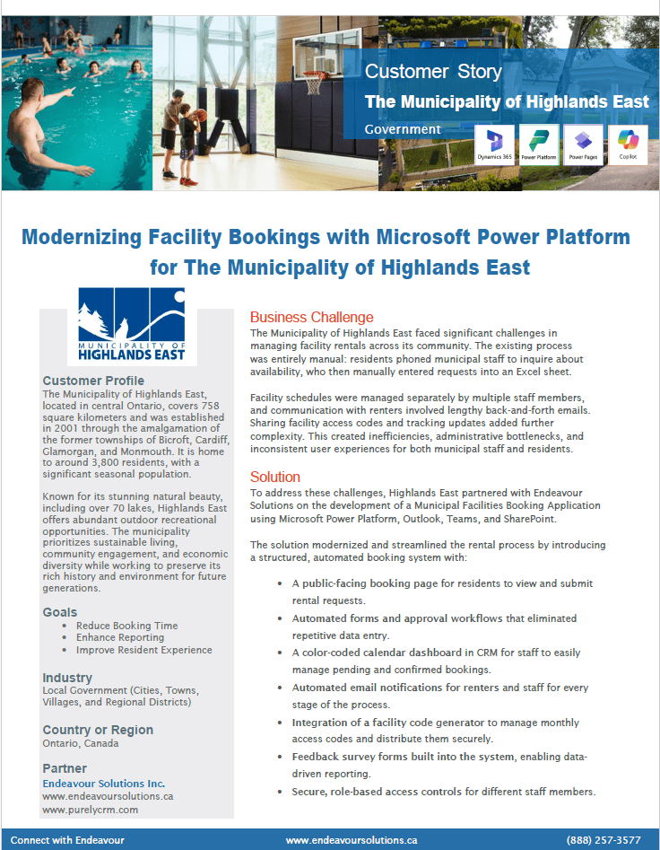 The Municipality of Highlands East wanted to reduce manual inputs, and have an efficient facility rental process that did not rely on phone calls, Excel sheets, and fragmented communication, leading to administrative bottlenecks. To achieve this, they partnered with Endeavor4 to build a streamlined Municipal Facilities Booking Application using Microsoft Power Platform, Outlook, Teams, and SharePoint.