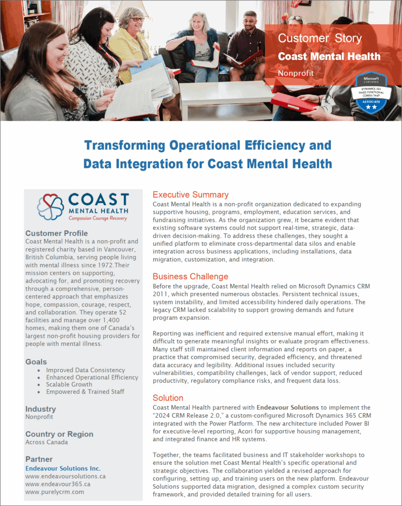 Coast Mental Health partnered with Endeavour Solutions to implement the “2024 CRM Release 2.0,” a custom-configured Microsoft Dynamics 365 CRM integrated with the Power Platform. The new architecture included Power BI for executive-level reporting, Acori for supportive housing management, and integrated finance and HR systems.